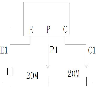 第一步:E1接線(xiàn)端與被測接地極相連,沿被測接地體E1使電位探測針P1和電流探測針C1成一直線(xiàn),各相距20m。?