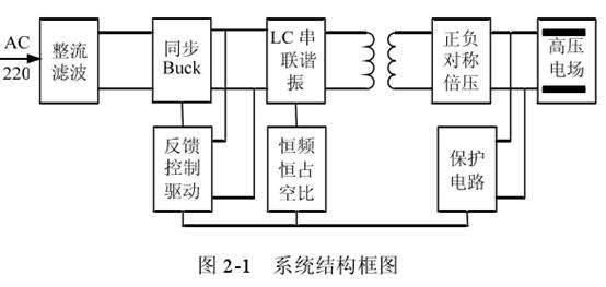 ? 由于電場(chǎng)用高壓電源要求輸出電壓大范圍線(xiàn)性可調,同時(shí)為了實(shí)現軟開(kāi)關(guān),本文前級采用輸出電壓大范圍可調的 DC/DC 電路,中間級為高頻 LC串聯(lián)諧振逆變電路,后級為正負雙向倍壓電路的三級方案,從而實(shí)現大范圍,低紋波,高可靠性的要求。系統整體結構框圖如下圖2-1所示。