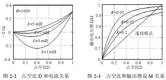 ? 加速器用的小功率電源由于電流小負載輕,電路在大范圍調壓時(shí)極易工作于斷續狀態(tài),占空比和輸入輸出電壓增益不再具有線(xiàn)性關(guān)系如上圖2-3所示。當電路具有相同輸出電壓時(shí),工作于連續模式與斷續模式相比具有更大的占空比。圖中 D<0.2時(shí),工作于 K=0.005時(shí),占空比 D 微小的變化引起輸出電壓很大變動(dòng),而連續導電模式中電路的增益始終保持線(xiàn)性變化。