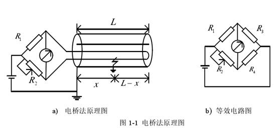 ? 電橋法作為阻抗法這一大類(lèi)方法中的一種,在電纜故障定位技術(shù)發(fā)展初期應用廣泛,電橋法進(jìn)行定位時(shí),將電纜視為集中參數元件,因此相同時(shí)刻上,電纜各處電流大小相等、相位相同,線(xiàn)路的電阻與長(cháng)度成正比。電橋法原理圖如圖 1-1? a)所示。