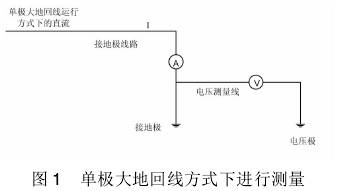 直流接地極接地電阻的測試可在單極大地回線(xiàn)運行方式下進(jìn)行,其測試的接線(xiàn)圖如圖 1 所示:這種測試方法要用到接地極線(xiàn)路作為電流測量線(xiàn),而電壓測量線(xiàn)需要人工布置,按照試驗標準的要求,電壓極要距離接地極的距離要大于接地極地網(wǎng)任意兩點(diǎn)最大距離的 10 倍,而直流接地極地網(wǎng)的直徑一般都較大,電壓測量線(xiàn)不僅需要用到很長(cháng)的測試線(xiàn),而且在現場(chǎng)試驗過(guò)程接地極所在位置通常不是平坦的地區,如果采用人工布線(xiàn),可能要翻越比較雜的地形條件才能達到試驗的要求,試驗現場(chǎng)工作量太大,也不利于進(jìn)行準確的測試。圖 1 單極大地回線(xiàn)方式下進(jìn)行測量并且在單極大地回線(xiàn)運行方式下,直流接地極線(xiàn)路注入接地極的電流通常達到 3 000 A 左右,現場(chǎng)試驗進(jìn)行電壓線(xiàn)布置具有很大的危險性,需要有很好的安全防護措施才能實(shí)現,并且進(jìn)行電壓線(xiàn)與接地極線(xiàn)路注入接地極部分的連接時(shí)也較為危險,因此,該種試驗方法不僅工作量大,而且具有很大的危險性,現場(chǎng)試驗過(guò)程中不具有可行性。