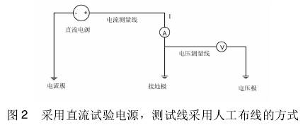 這種測試方法只能在雙極停運時(shí)才能進(jìn)行,但是需要人工拆除接地極線(xiàn)路的跳線(xiàn),還需要人工布置電流線(xiàn)和電壓線(xiàn)。電壓線(xiàn)和電流線(xiàn)的布置可以在相同方向布置,也可在不同方向布置,但按照方法 1 中所講到的試驗電壓線(xiàn)的布置需要近 10 km,而電流線(xiàn)的布置長(cháng)度要大到電壓線(xiàn)長(cháng)度的 1. 618 倍,也即電流線(xiàn)要達到16. 18 km,這么長(cháng)的試驗線(xiàn)的布置在實(shí)際試驗過(guò)程中是很難達到要求的,并且在現場(chǎng)試驗過(guò)程中,直流試驗電源一般都需要有外接電源,如果將試驗儀器搬至現場(chǎng),又面臨試驗電源難于得到的困難,因此該種方式不具有可行性。圖 2采用直流試驗電源,測試線(xiàn)采用人工布線(xiàn)的方式