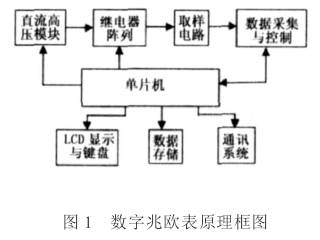 數字兆歐表主要由直流高壓模塊、繼電器陣列、取樣電路、數據采集與控制、LCD顯示與鍵盤(pán)、數據保存和USB通訊等7大部分組成,其原理框圖如圖1所示。具體的工作原理為:直流高壓經(jīng)過(guò)繼電器陣列,施加到被測電源線(xiàn)的兩向間,取樣電路的電信號經(jīng)過(guò)ICL7135數據采集轉化為數字信號,單片機將數字信號進(jìn)行計算,轉化為絕緣值,同時(shí)進(jìn)行數據保存、報捷判斷,同時(shí)根據設置進(jìn)行換向檢測,直到把各個(gè)向間的絕緣值全部檢測完為止。