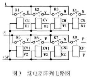 數字兆歐表主要是用來(lái)檢測列車(chē)供電線(xiàn)路絕緣情況的,特別是其交流線(xiàn)路,按照規定列車(chē)交流供電線(xiàn)路一般是380V或600V,且有U、V、W、N向,在檢測絕緣時(shí)除了要求檢測任意兩向之間的電阻值外,還需要各向對列車(chē)外殼P的電阻值,這樣一共就有5向10種組合電阻值,因此采用繼電器陣列來(lái)實(shí)現各向間的組合測量。電路如圖3所示,當繼電器U1和V2閉合時(shí)就檢測U和V向間的絕緣值,其它的向間值類(lèi)似,這樣利用繼電器陣列,通過(guò)表的Port1接口與列車(chē)上U、V、W、N、P線(xiàn)一一對應連接就可以循環(huán)檢測各向間的絕緣值,避免使用搖表需要人工切換的過(guò)程。