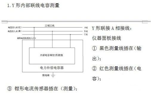 電力電容器組內部聯(lián)線(xiàn)方式一般采用星形聯(lián)接(Y)和三角形聯(lián)接(△)。實(shí)際運行經(jīng)驗表明,三角形聯(lián)接電容器組其損壞率遠高于星形聯(lián)接電容器組,目前高壓并聯(lián)電容器組多數采用星形聯(lián)接。該儀器可測試電力高壓并聯(lián)電容器組,其內部連接方式有:三相△形、三相Y形、三相Yn形、三相Ⅲ形。按接線(xiàn)圖(1)三相Y形A相測量接線(xiàn)方法,測量線(xiàn)由儀器測量輸出端對應插好,將紅色夾子夾在母線(xiàn)排A相上、黑色夾子夾在母線(xiàn)B相上,然后將電流測量線(xiàn)插在儀器接口上擰緊、鉗形傳感器應套在高壓電容器組A相引線(xiàn)上,方可測量,完成后轉下一相接線(xiàn)。