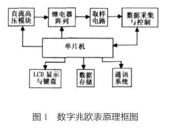 數字兆歐表主要由直流高壓模塊、繼電器陣列、取樣電路、數據采集與控制、LCD顯示與鍵盤(pán)、數據保存和USB通訊等7大部分組成,其原理框圖如圖1所示。具體的工作原理為:直流高壓經(jīng)過(guò)繼電器陣列,施加到被測電源線(xiàn)的兩向間,取樣電路的電信號經(jīng)過(guò)ICL7135數據采集轉化為數字信號,單片機將數字信號進(jìn)行計算,轉化為絕緣值,同時(shí)進(jìn)行數據保存、報捷判斷,同時(shí)根據設置進(jìn)行換向檢測,直到把各個(gè)向間的絕緣值全部檢測完為止。