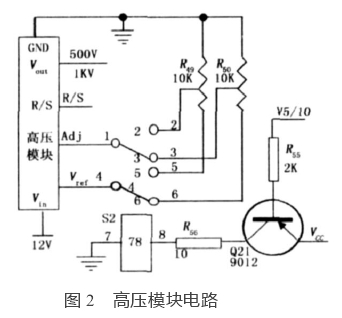 數字兆歐表測量的基本原理與兆歐表(搖表)類(lèi)似,兆歐表(搖表)是利用手搖發(fā)電機產(chǎn)生高壓進(jìn)行測量,其輸出的額定電壓為500 V(轉速為120r/min),而數字兆歐表對此做了一些改進(jìn),采用直流高壓模塊代替手搖發(fā)電機,這就避免了由于手搖轉速不夠引起的高壓的不穩定問(wèn)題,針對鐵路列車(chē)的要求,特別將高壓模塊的額定電壓設置為500V/1kV兩擋可調,對不同的線(xiàn)路選擇不同的測量電壓。電路如圖2所示,高壓模塊電壓輸入Vin是12V,利用V5/10位控制繼電器S2選擇R49或R50來(lái)確定輸出電壓Vout為500V還是1kV,對于380V或600V交流供電線(xiàn)路采用1kV高壓測量,而對于列車(chē)48V或110V直流供電線(xiàn)路采用500V高壓測量, R/S是高壓模塊的電壓轉化的起??刂莆?。