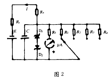 取樣可以分為電流取樣和電壓取樣兩種形式。電流取樣是直接采集流經(jīng)試品的電流,如圖2所示。圖中,Rx為被測件,流過(guò)Rx的測試電流油微安表指示;R1、R2、R3、R4為分流電阻,用以實(shí)現量程轉換;電容呀口穩壓管D1、D2為保護元件。指針式兆歐表多采用電流取樣的方法。