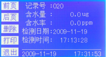 打?。捍蛴‘斍暗臍v史記錄,打印內容包括:樣品編號、含水量、含水率、檢測日期、檢測時(shí)間。