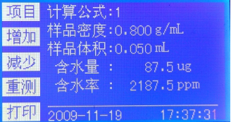 1、輸入樣品密度及體積,自動(dòng)計算出樣品質(zhì)量并計算出樣品的含水率,含水率單位為ppm。如圖6-8;