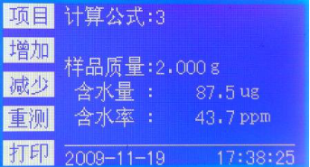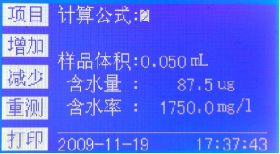 2、輸入樣品體積,自動(dòng)計算樣品的含水率,含水率單位為mg/L。如圖6-9;