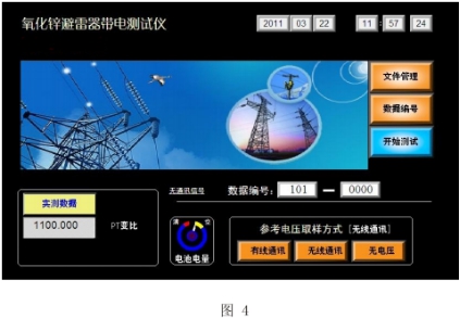 儀器開(kāi)機后的界面,如圖4和如圖5所示。圖4是“無(wú)線(xiàn)通訊”和“有線(xiàn)通訊”模式下的顯示界面。區別是:“無(wú)線(xiàn)通訊”和“有線(xiàn)通訊”模式下,左下角顯示PT變化;“無(wú)電壓”模式下,顯示系統線(xiàn)電壓和移相角度。