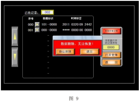 圖9是“刪除文件”(相當于格式花)的界面,儀器不支持一條一條記錄的刪除,一次性刪除所有記錄。因此,操作要謹慎。