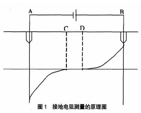 接地電阻測量的原理如圖1 所示,在土壤中埋設兩個(gè)接地體A 和B,AB 之間有一定的距離,當電流經(jīng)接地體和大地構成回路時(shí),則在接地體周?chē)彤a(chǎn)生電壓降,電位分布具有以下特點(diǎn):