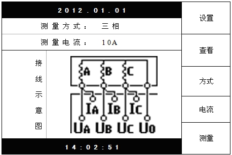 “方式”鍵:設置測量方式,包括“單相”、“兩相”和“三相”。并且在“接線(xiàn)示意圖”的區域會(huì )顯示相應的接線(xiàn)圖,可作為實(shí)際接線(xiàn)時(shí)的參考。