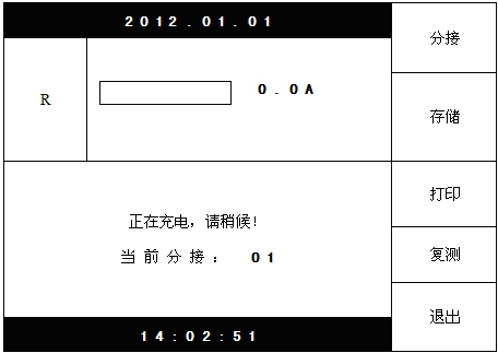 此時(shí),繞組的電流開(kāi)始逐漸上升,如果充電進(jìn)度條和電流顯示值長(cháng)時(shí)間停滯不前,則可能所測阻值超出當前電流的測量范圍,電流因此達不到預設值。此時(shí)可按“退出”鍵返回,重新選擇電流再試。當達到預定的電流的時(shí)候,進(jìn)入恒流狀態(tài)。并進(jìn)入下一界面: