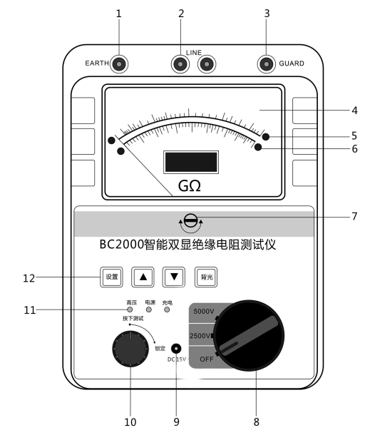 (1)有多種電壓輸出選擇BC2000(2500V/5000V)、BC2010(500V、1000V、2500V、5000V),測量電阻量程范圍可達0~200GΩ,電阻量程范圍可自動(dòng)轉換,并有相應的指示。