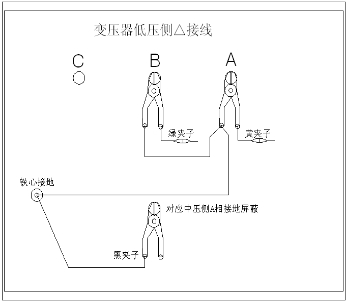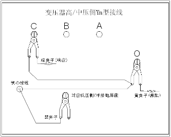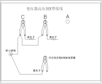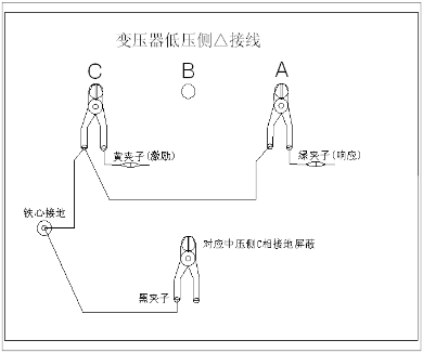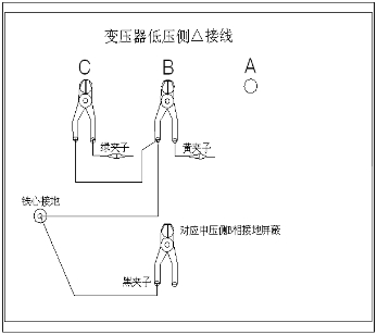 ◇地線(xiàn)連接網(wǎng)依次由綠夾子地線(xiàn)孔插入接地線(xiàn)至黃夾子地線(xiàn)孔,再由一根地線(xiàn)轉接到鐵芯接地。將黑夾子連接至鐵芯接地,鉗在低壓側C相上。