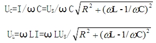 (4)、電感上的電壓UL與電容上的電壓UC數值相等,相位相差180°,UL=UC=QUS。