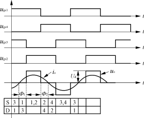 在圖3中,諧振脈沖寬度調制是通過(guò)改變兩對開(kāi)關(guān)管的驅動(dòng)信號之間的相位差來(lái)改變輸出電壓值以達到調節功率的目的。即在控制電路中使原來(lái)同相的兩個(gè)橋臂開(kāi)關(guān)(S1,S2)、(S3,S4)的驅動(dòng)信號之間錯開(kāi)一個(gè)相位角,使得輸出的正負交替電壓之間插入一個(gè)零電壓值,這樣只要改變相位角就可以改變輸出電壓的有效值,最終達到調節輸出功率的目的。