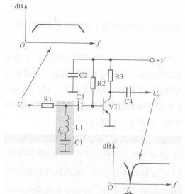 (2)輸入信號頻率高于或低于石。對于輸入信號中頻率高于或低于fo的信號,由于與Ll和Cl的諧振頻率不等,這時(shí)Ll和Cl串聯(lián)電路失諧,其阻抗很大,其輸入信號不會(huì )被Ll和Cl旁路到地,而是加到了VT1基極,經(jīng)VT1放大后輸出。