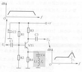 由于Ll和C4電路在諧振時(shí)的阻抗最小,與發(fā)射極負反饋電阻R4并聯(lián)后負反饋電阻最小,因此此時(shí)的放大倍數最大。這樣,接近fo的高頻信號得到提升,如圖中放大器的頻響特性曲線(xiàn)所示,不加Ll和C4時(shí)的高頻段響應曲線(xiàn)為虛線(xiàn),加入Ll和C4時(shí)的為實(shí)線(xiàn),顯然實(shí)線(xiàn)的高頻段響應優(yōu)于虛線(xiàn)。