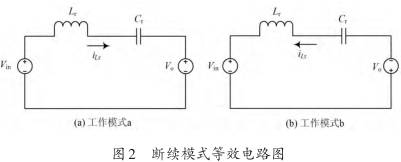 根據電感電流的連續與否,變換器工作模式分為兩 種 :連 續 導 電 模 式(CCM)和 不 連 續 導 電 模 式(DCM)。當開(kāi)關(guān)頻率大于 1 2 的諧振頻率時(shí),串聯(lián)諧振變換器是工作在電流連續模式下的;當開(kāi)關(guān)頻率小于1 2 的諧振頻率時(shí),串聯(lián)諧振變換器是工作在電流斷續模式下的,這樣開(kāi)關(guān)工作在零電流(ZCS)條件下,可以降低開(kāi)關(guān)損耗,提高電源的效率。斷續工作模式的半個(gè)開(kāi)關(guān)周期包含a,b,c三種工作狀態(tài)。假設負載電容值遠遠大于諧振電容的電容,因此在一個(gè)諧振周期內,負載電容的電壓上升非常小,在分析過(guò)程中將其看成一個(gè)恒壓源。根據以上分析;a,b工作模式的等效電路如圖2所示。c表示諧振電流為零時(shí)的工作模式(其狀態(tài)電路圖省去)。