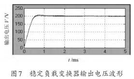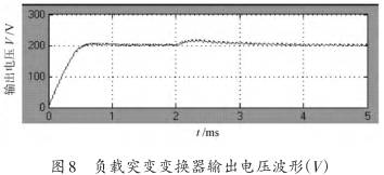 為了驗證補償器的性能,對串聯(lián)諧振變換器閉環(huán)系統進(jìn)行了仿真分析。圖7為串聯(lián)諧振變換器加入閉環(huán)控制后的輸出電壓波形。開(kāi)環(huán)系統的調節時(shí)間大約為6 ms (如圖4所示),閉環(huán)系統的調節時(shí)間大約為0.8 ms,超調量大約為1%,響應速度有明顯的提高。當負載電阻由4.8 Ω跳變至8 Ω時(shí)(其他參數固定不變),電路輸出電壓動(dòng)態(tài)仿真波形如圖8所示。從圖8可以看出,當負載發(fā)生較大突變時(shí),輸出電壓能較快的調節穩定,調節時(shí)間大約為1 ms,達到了較好的動(dòng)態(tài)調節性能。