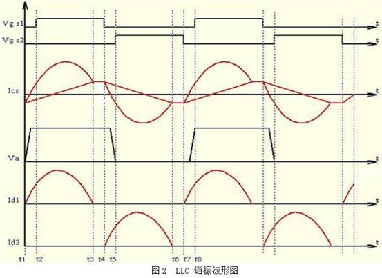 圖1和圖2分別給出了 LLC 諧振變換器的電路圖和工作波形。圖1中包括兩個(gè)功率 MOSFET(S1 和S2),其占空比都為0.5;諧振電容 Cs,副邊匝數相等的中心抽頭變壓器 Tr,Tr 的漏感Ls,激磁電感 Lm,Lm 在某個(gè)時(shí)間段也是一個(gè)諧振電感,因此,在 LLC諧振變換器中的諧振元件主要由以上3個(gè)諧振元件構成,即諧振電容 Cs,電感 Ls 和激磁電感 Lm;半橋全波整流二極管 D1 和 D2,輸出電容 Cf。LLC 變換器的穩態(tài)工作原理如下: