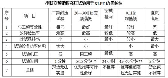 現就XLPE試驗的幾種主要方法做一對比說(shuō)明。明顯可以看出被國內、外有關(guān)標準化機構和專(zhuān)家推薦的串聯(lián)變頻諧振試驗的優(yōu)越性。