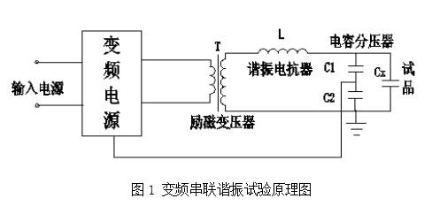 通過(guò)調節變頻電源的輸出頻率,使回路處于串聯(lián)諧振狀態(tài);調節變頻電源的輸出電壓幅值,使試品上的高電壓達到試驗電壓的要求。
