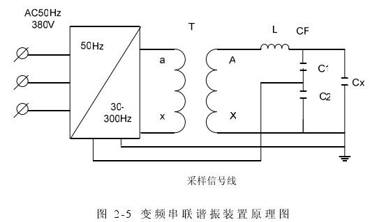 變頻串聯(lián)諧振裝置原理圖見(jiàn)圖2-5。380V工頻交流電送入變頻電源,經(jīng)變頻電源處理后,輸出頻率、幅值可調節的電壓,輸出電壓送勵磁變壓器T的低壓側,經(jīng)勵磁變壓器升壓后送入由試驗電抗器、電容分壓器以及被試品構成的串聯(lián)諧振回路,回路諧振頻率f由試驗電抗器電感L、試品電容、分壓器電容和共同決定。在變頻電源較小的輸出電壓下調節其輸出頻率,當輸出頻率等于諧振頻率,串聯(lián)諧振回路發(fā)生串聯(lián)諧振,再調節變頻電源輸出電壓使試品電壓到達試驗值。在回路諧振的條件下,試品電壓為勵磁變壓器輸出電壓的Q倍,試品試驗容量為勵磁變壓器輸出容量的Q倍。