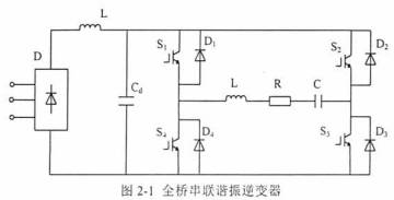 串聯(lián)諧振逆變器分為全橋串聯(lián)諧振逆變器和半橋串聯(lián)諧振逆變器兩類(lèi),首先 對全橋串聯(lián)諧振逆變器進(jìn)行介紹,其電路結構如圖2-1所示。
