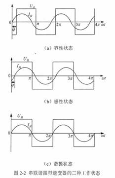 串聯(lián)型逆變器根據負載工作狀態(tài)的不同可以分為三種工作模式:容性狀態(tài)、 感性狀態(tài)和諧振狀態(tài),圖2.2(a)、(b)、(C)分別為三利,狀態(tài)下負載電壓和電流 的相位關(guān)系,其中%、助分別為負載電壓、負載電流的波形,妒為負載電壓與 負載電流之間的相位角。 如圖2.2(a)所示,當負載工作于窬性狀態(tài)時(shí),負載電流超j仃負載電壓p電 角度,在換流過(guò)程中,負載電流由負變『F時(shí),電壓仍為負,導致反并聯(lián)二極管短 時(shí)通過(guò)負載電流,由于二極管的反向恢復作用,使逆變器出現短時(shí)橋臂直通現象, 由此產(chǎn)生的大電流將損壞開(kāi)關(guān)管IGBT。 如圖2.2(b)所示,當負載工作于感性狀態(tài)時(shí),負載電壓超自仃負載電流妒電 角度,電流換向時(shí),電壓已換為正,感性狀態(tài)下實(shí)現了丌關(guān)管的零電流丌通。 如圖2.2(c)所示,當負載工作在諧振狀態(tài)時(shí),負載電壓、電流同時(shí)換向, 丌關(guān)管零電流開(kāi)通和關(guān)斷,此種狀態(tài)下不存在二極管的反向恢復問(wèn)題,丌關(guān)損耗 最小,但這種理想的換流點(diǎn)很難實(shí)現。