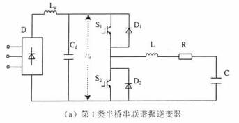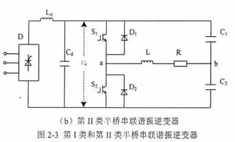 由圖2-3所示兩種半橋串聯(lián)諧振逆變器可知,橋臂諧振電容與負載串聯(lián),而 不是自成回路,即流過(guò)負載的電流將全部流過(guò)開(kāi)關(guān)管IGBT,因此,在這種電路 中一般采用多個(gè)開(kāi)關(guān)管并聯(lián)。兩類(lèi)半橋串聯(lián)諧振逆變器結構上的不同在于:對于 第1類(lèi)半橋串聯(lián)諧振逆變器,諧振電容與負載槽路直接串聯(lián),此類(lèi)逆變器一般應 用于小功率領(lǐng)域;對于第1I類(lèi)半橋串聯(lián)諧振逆變器,兩個(gè)諧振電容相當于逆變 器的兩個(gè)橋臂,二者相當于并聯(lián)之后再與負載槽路串聯(lián),一般應用于較大的功率領(lǐng)域。