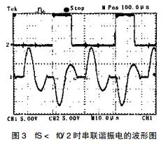 串聯(lián)諧振充電電路的動(dòng)態(tài)工作狀態(tài)是由電路的固有頻率 f0 和開(kāi)關(guān)管的工作頻率 fS 之間的關(guān)系決 定的, 根據工作頻率 fS 和固有頻率 f0 的關(guān)系, 可 以決定電路中的諧振電流是連續的還是斷續的。 實(shí)驗中諧振電容為 0. 4 F, 諧振電感為 18 H, 根據公式可算出該電路的固有諧振頻率 f0= 1/ 2π? LC= 59 kHz, 下面根據不同的工作頻率時(shí)的不同 電流波形進(jìn)行說(shuō)明。 當開(kāi)關(guān)元件的工作頻率小于諧振頻率的一半 (fS< f0/ 2) 時(shí), 實(shí)驗中工作頻率為 22. 73kHz, 測 得的電流波形如圖 3: