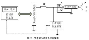 交流耐壓試驗系統的連接如圖 2.2 所示,交流耐壓試驗系統共分為以下四個(gè)部分:控制操作系統、交流高壓產(chǎn)生系統、交流高壓測量系統、保護電阻。