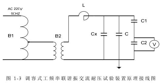 調容式工頻串聯(lián)諧振交流耐壓試驗裝置就是通過(guò)調節試驗回路中的調諧電容器,與回路中固定的調諧電感配合,使整個(gè)試驗回路在工頻(50HZ)下發(fā)生諧振,其原理接線(xiàn)見(jiàn)圖1-3: