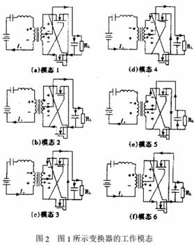 圖2給出了變換器所有可能的工作模態(tài)。 在圖2中,模態(tài)1和模態(tài)3表示能流從輸入邊 傳送到輸出邊。模態(tài)2和模態(tài)4對應于在模態(tài)1和模態(tài)3之間的過(guò)渡狀態(tài)。模態(tài)5和模態(tài)6表示能流從輸出電容反饋到輸入邊。這種能流回饋狀態(tài)是同步整流所特有的。在二極管整流電路中,只有能流 前饋,即能量從輸入邊流到輸出邊的狀態(tài),而沒(méi)有能流回饋狀態(tài),即能量從輸出邊回流到輸入邊。然而在用MOSFET作同步整流電路中,當柵源電壓Ugs大 于閾值時(shí),MOSFET會(huì )一直保持開(kāi)通。因此,如圖2中模態(tài)5,6能量回饋的現象出現了。環(huán)流增加了能量損耗,導致效率的下降。