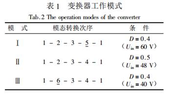 表1給出了在一個(gè)開(kāi)關(guān)周期里的所有可能的工作模式和每一模式中模態(tài)轉換次序。