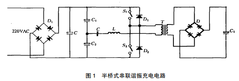 電路由分壓電容 C 1, C2、諧振電容 C、諧振 電感 L ; 功率開(kāi)關(guān)元件 S 1、S 2; 快速反向恢復二極 管 D 1, D 2; 高頻隔離升壓變壓器 T 和高頻全橋整 流電路 D 組成, 為電容 C3 充電. 假設電容 C1 = C 2, 且比諧振電容 C 大的多, 則電路在開(kāi)關(guān) S 1 或 S 2 合上時(shí), 串聯(lián)諧振等效電路如圖 2 所示.