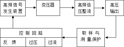 直高發(fā)應用最新電力電子技術(shù),采用先進(jìn)的PWM調制技術(shù)及大功率MOSFET器件,通過(guò)中頻倍壓整流而成;該發(fā)生器具有紋波系數小、輸出穩定可靠,體積小、重量輕的特點(diǎn),且具有可靠、靈敏的內部保護功能,其原理框圖如圖1所示。
