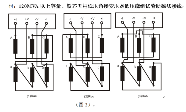在使用中,如果儀器隨帶的測試線(xiàn)長(cháng)度不夠,可使用直徑相當的導線(xiàn)將測試線(xiàn)加長(cháng)。(附 圖2 120MVA以上容量、鐵芯五柱低壓角接變壓器低壓繞組試驗助磁法接線(xiàn))