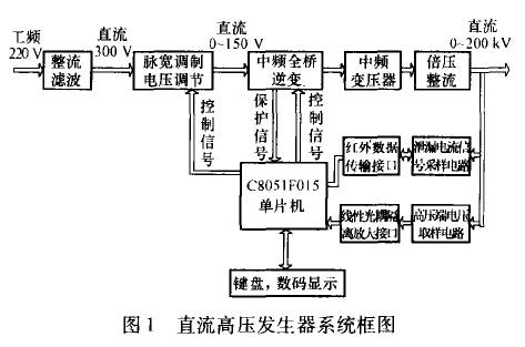 本文介紹的直流高壓發(fā)生器,采用Cygnal公司新一代系統級單片機C8051陽(yáng)巧。該單片機功能強大,擴展性好。通過(guò)精心設計應用電路,使用脈寬調制調壓技術(shù)中頻逆變技術(shù),儀器實(shí)現了數字化的電壓調節輸出,良好的人機設置操作,PWM調制控制,過(guò)流保護,通信打印功能等。特別是紅外式的泄漏電流測量,大大改進(jìn)了當前的測量方式,使用者不需要再用微安表,可在控制面板上直接讀數。整機性能達到額定功率400w,輸出直流電壓從零起調,最高200kV,電流2mA,脈動(dòng)系數小于1%泄漏電流是通過(guò)在輸出端設置電流信號采樣板,然后通過(guò)紅外數據傳輸的方式將泄漏電流信號傳送到主機,實(shí)現了精確的電流測量又解決了信號讀取問(wèn)題。在電壓控制方式上,該設計采用了大回路電壓反饋控制,由單片機來(lái)實(shí)現控制算法,由于C8051印巧單片機片內資源豐富,而且芯片工作頻率高達25MzH,完全可以滿(mǎn)足控制的實(shí)時(shí)性需要,保證了設計的成功實(shí)現。