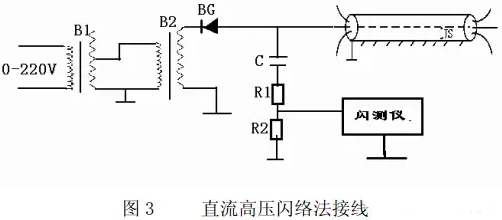 直流高壓閃絡(luò )法適用于閃絡(luò )性故障,即故障點(diǎn)沒(méi)有形成電阻信道(或電阻值極高),但電壓升高到一定值時(shí)(通常是幾萬(wàn)伏)就會(huì )產(chǎn)生閃絡(luò )現象。 直流高壓閃絡(luò )法的接線(xiàn)圖如圖 3 所示。