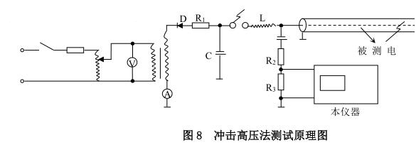 (4)直閃法的測試原理圖如圖 2。在實(shí)際測試時(shí)利用高壓設備和本公司高壓測試裝置,按圖 8 所示線(xiàn)路連接。