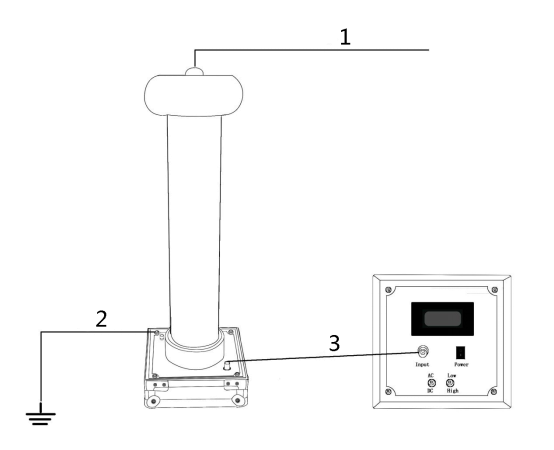 按圖4所示接線(xiàn)方法正確接線(xiàn)。高壓輸入接均壓球頂端接線(xiàn)柱,接地柱通過(guò)儀器配套接地線(xiàn)連接到大地,高壓分壓器和低壓顯示表通過(guò)儀器配套同軸電纜連接。連接好后,檢查連線(xiàn),確認無(wú)誤后,選擇相應的檔位和量限即可開(kāi)始測量。
