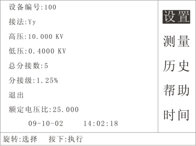 旋轉鼠標,“接法”菜單反顯,按下鼠標,“Yy”反顯,旋轉鼠標,修改接法,按下鼠標,“高壓”反顯。