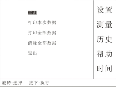 菜單菜操作方法與前面相同。在這個(gè)菜單中完成,重測,打印數據,清除數據,返回主菜菜單等功能。
