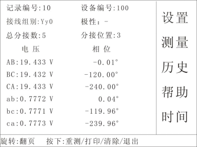 一次測量結果按二屏來(lái)顯示。第一屏顯示變比,第二屏顯示電壓。此時(shí),旋轉鼠標。屏幕顯示見(jiàn)圖五。屏幕上顯示了高壓和低壓的各個(gè)電壓的幅值和相位。